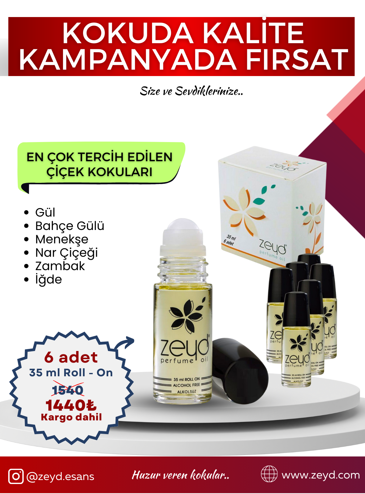 Çiçek Kokuları Seti Alkolsüz Esans Roll on EDP Unisex 35 ml 6 Adet paket içeriği