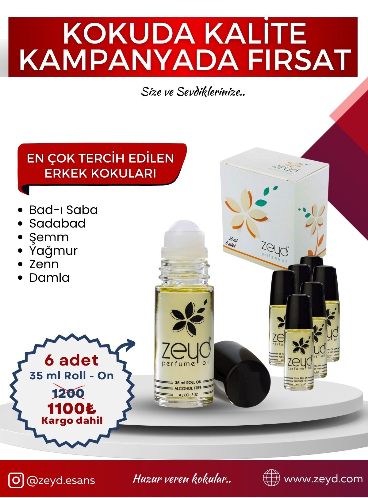 Erkek Kokuları Seti Alkolsüz Esans Roll on EDP Unisex 35 ml 6 Adet paket içeriği